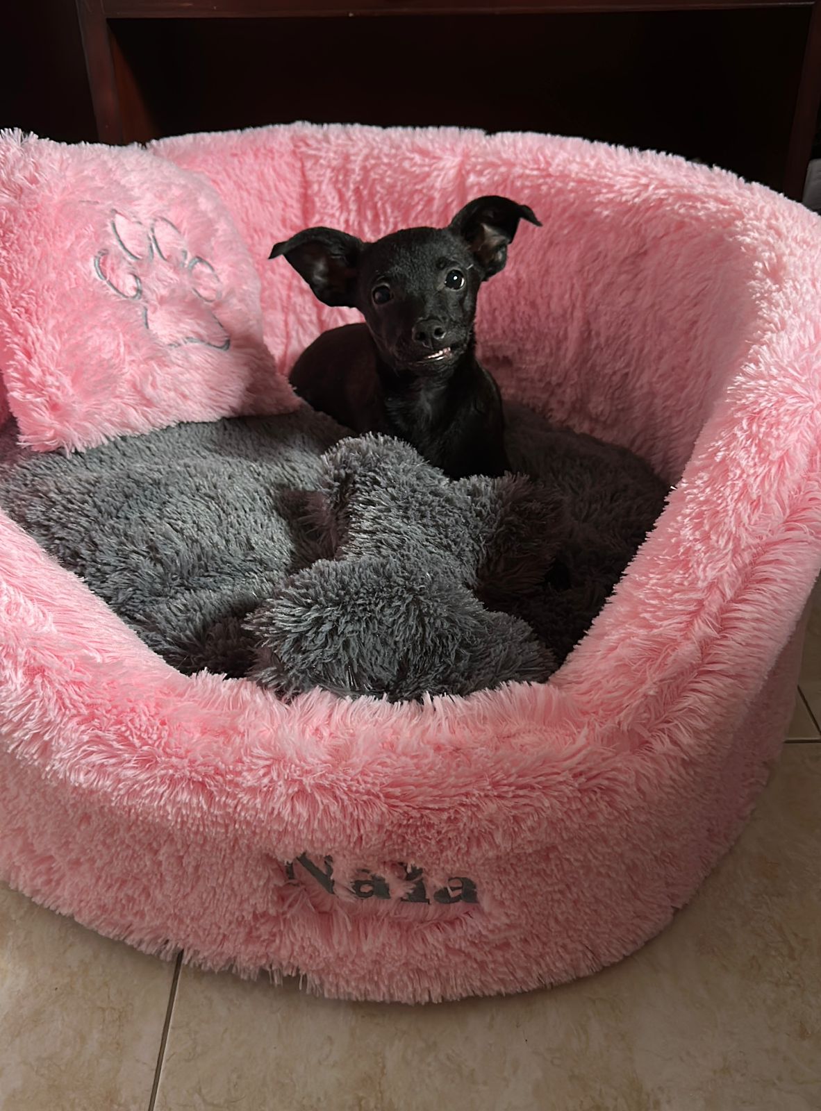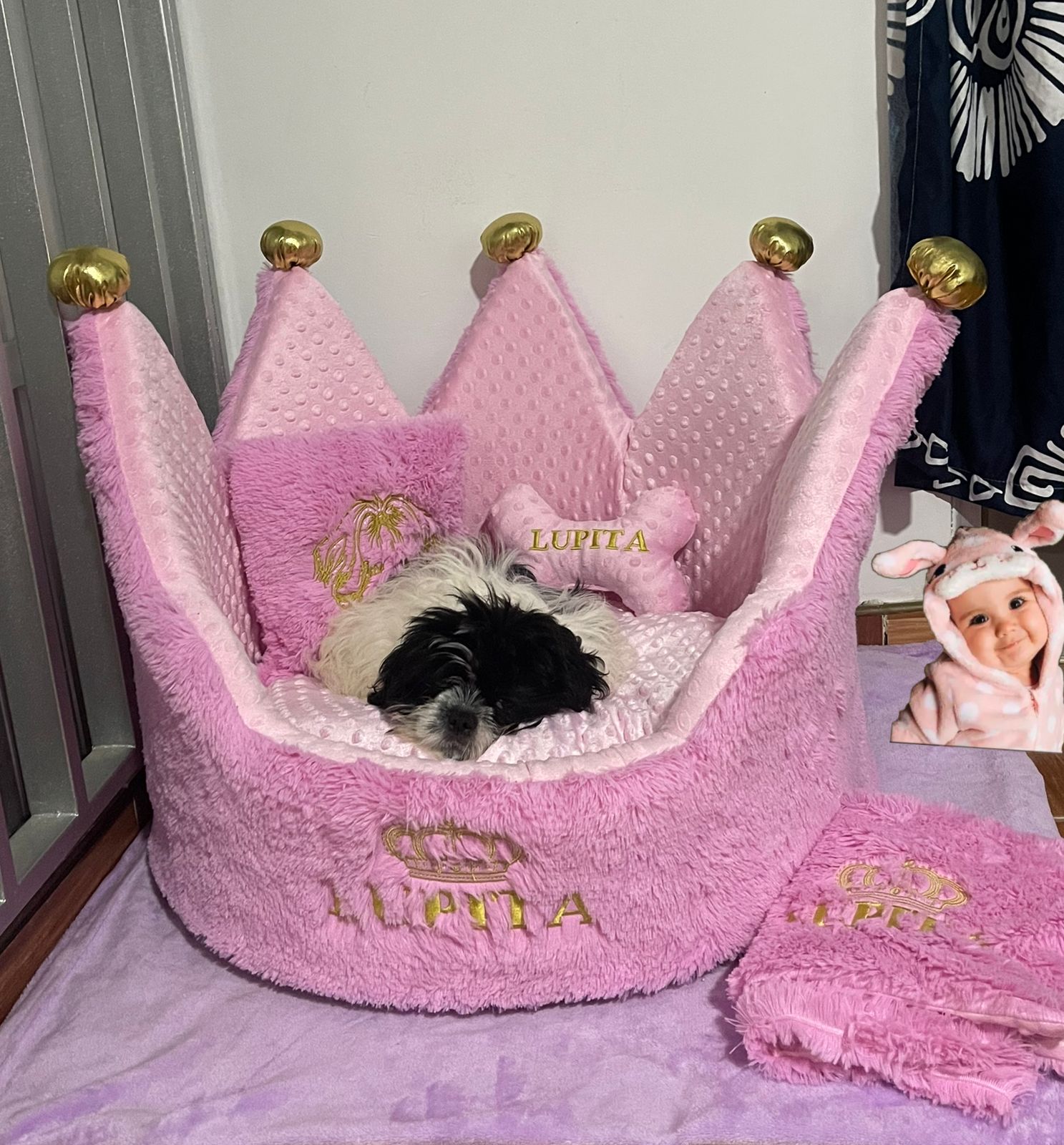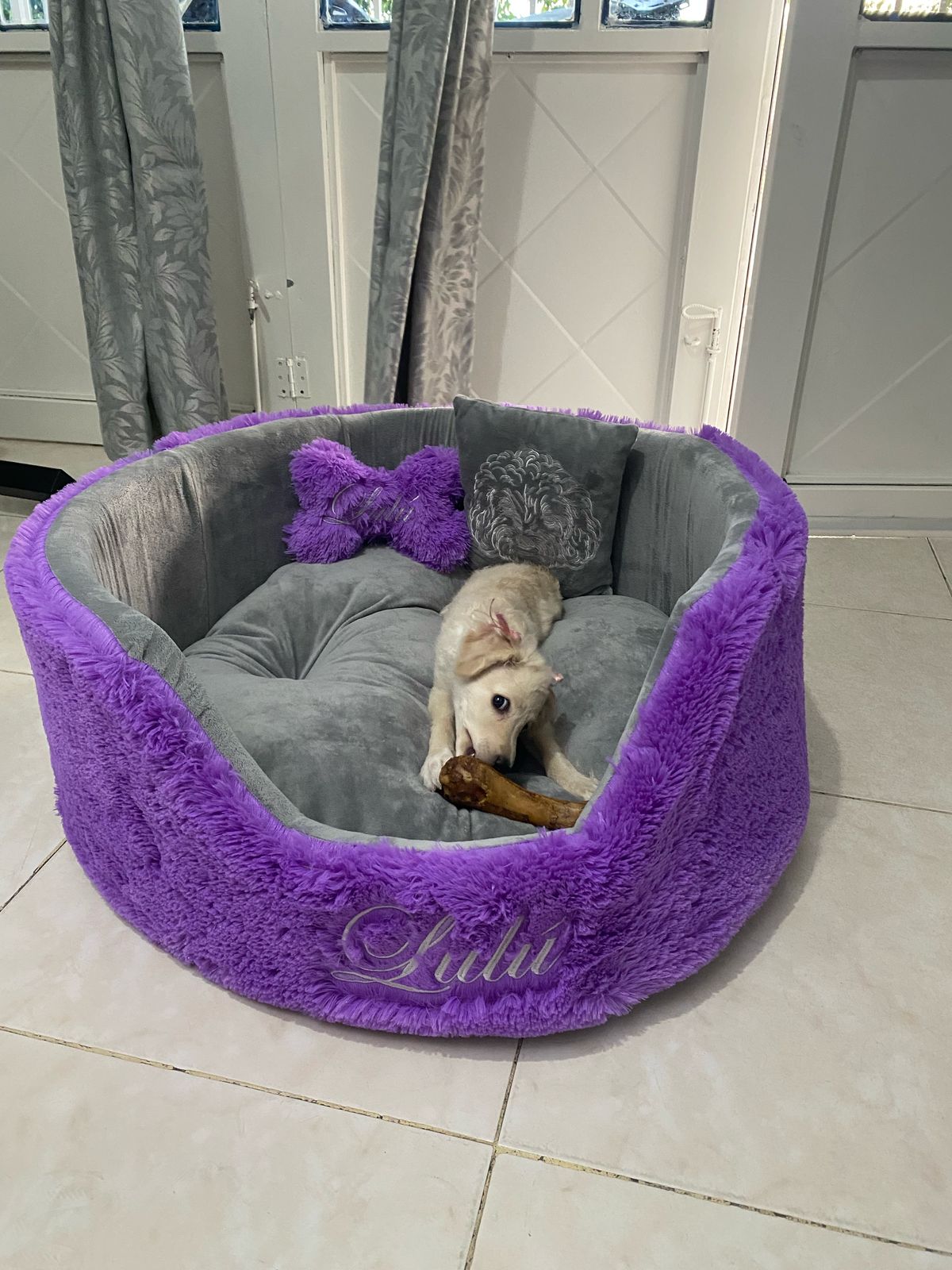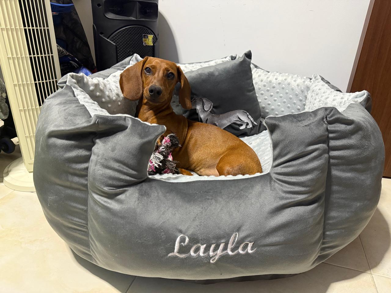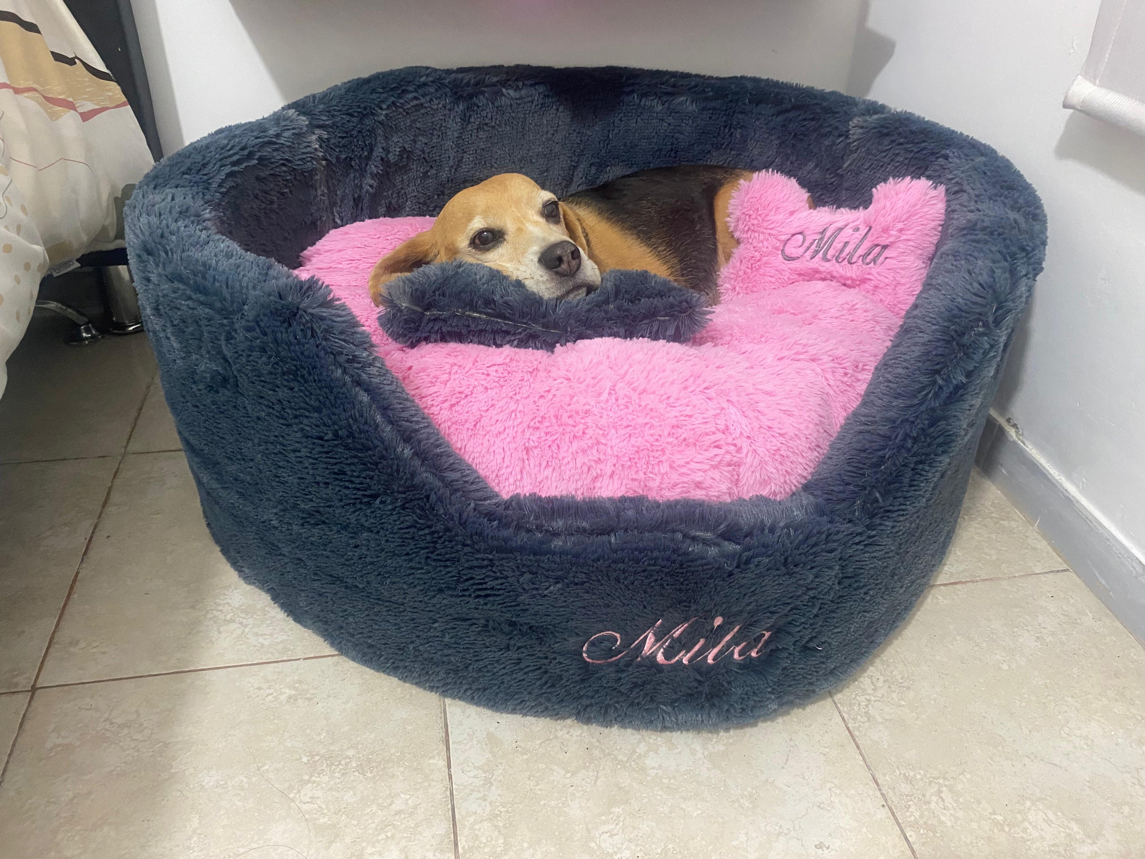 Cada cama está personalizada con el nombre de tu peludo y detalles bordados únicos.